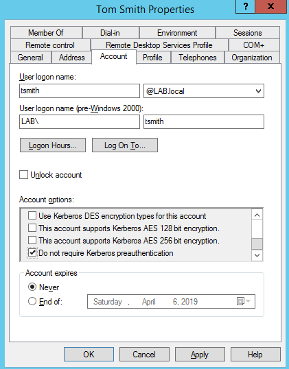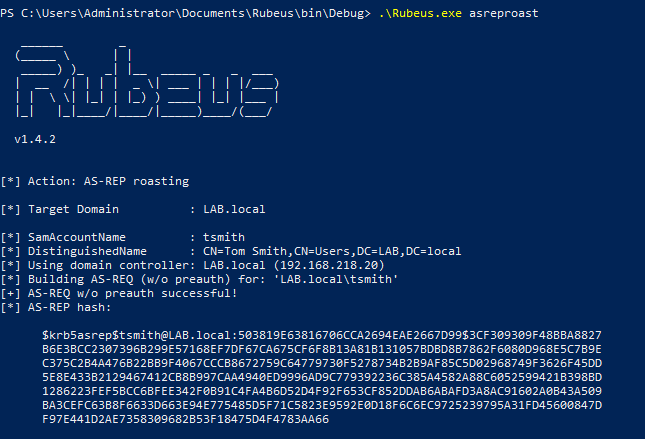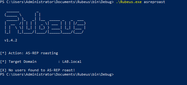 If no users have ‘Do not require Kerberos preauthentication’ checked, then there won’t be any users to roast. But if there is…