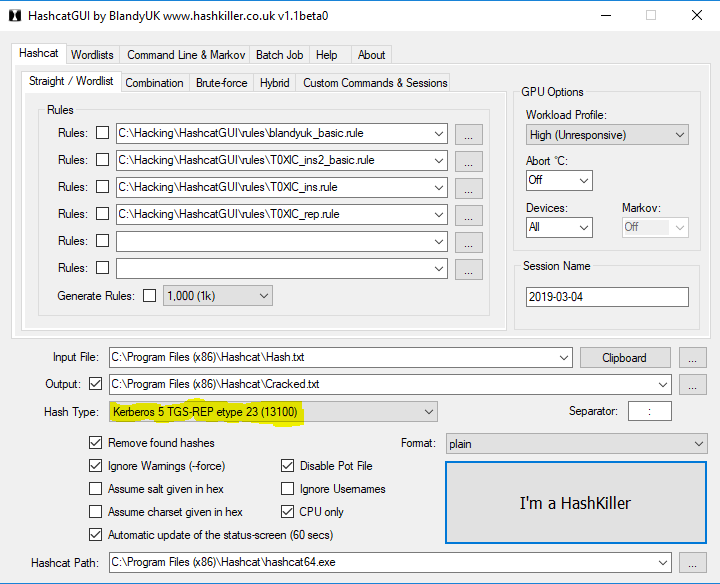And now we have the hash to a service account. I load it into hashcat (GUI, of course) and select hash type 13100, as highlighted below
