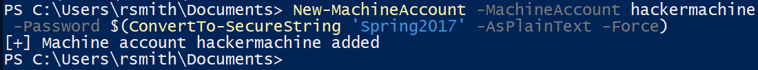 New-MachineAccount -MachineAccount hackermachine -Password $(ConvertTo-SecureString 'Spring2017' -AsPlainText -Force)
