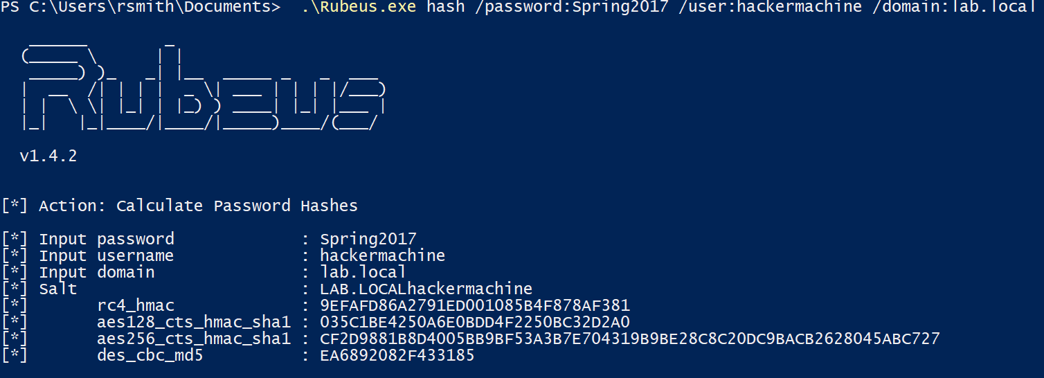 .\Rubeus.exe hash /password:Spring2017 /user:hackermachine /domain:lab.local