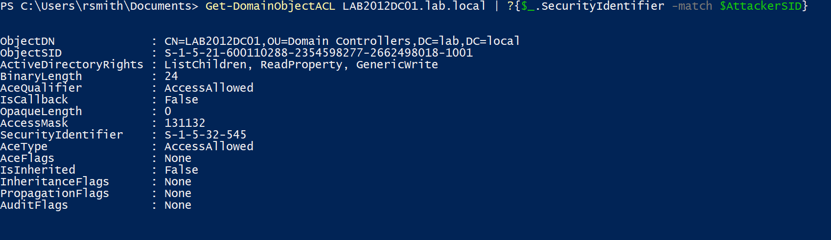 Get-DomainObjectACL LAB2012DC01.lab.local | ?{$_.SecurityIdentifier -match $AttackerSID}