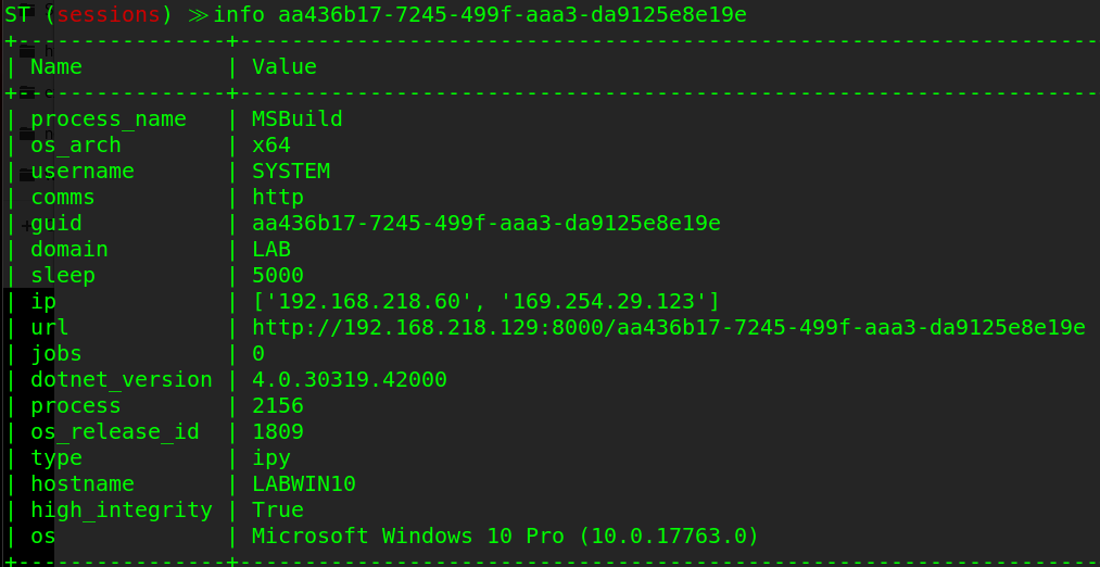 And listing the info for the session reveals my username is SYSTEM, meaning I escalated from user tsmith to SYSTEM, due to the fact that MSBuild.exe ran with the –exec-method atexec option, which uses Task Scheduler with SYSTEM privileges (or whatever the highest possible it) to run the command.